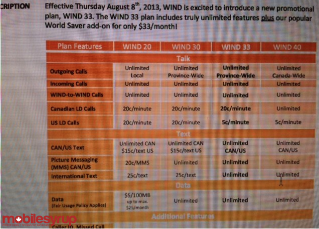 According to the internal doc we received it states that “the promotional WIND 33 plan will qualify for a maximum WINDtab of up to $200.” In addition, the WIND 33 promotional plan is eligible with the Better Together Savings, but not compatible with BYOP (bring your own phone). If you’re a current WIND subscriber and want to hop on this plan you’ll have to call WIND Customer Care, then pay a one-time processing fee of $25. The doc shows the new WIND 33 plan will be in place until September 30th.