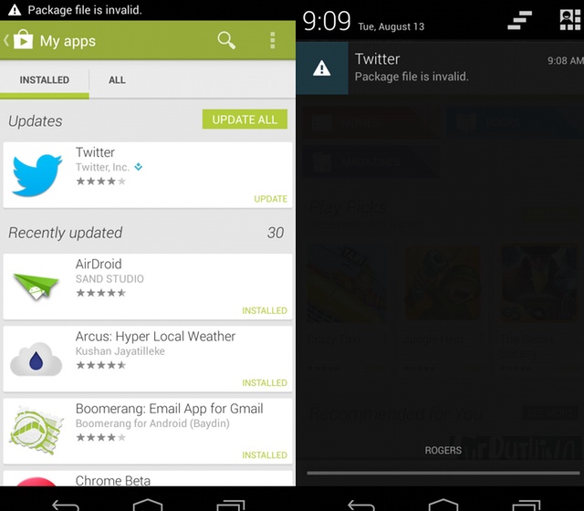 For example, the new Twitter 4.1.5 keeps giving a “Package file is invalid” error when downloading, but most other apps are fine. The issue should clear in a few days, but Google has not stated an explicit reason for the issue.