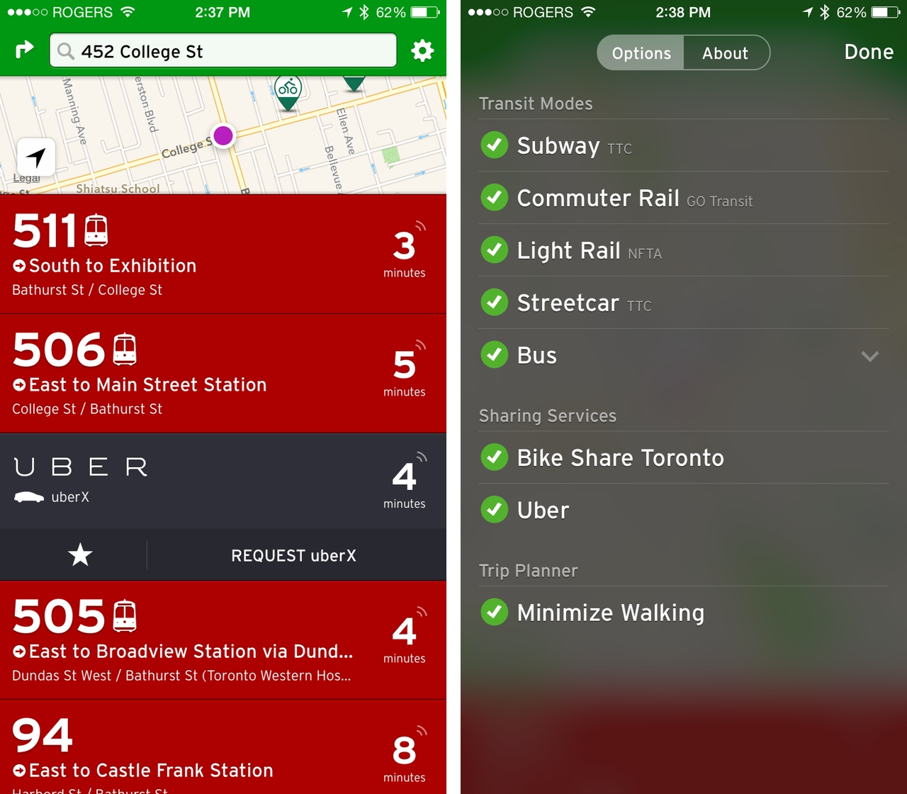 In a blog post, Transit App said that it considers ridesharing programs like UberX a form of urban transit, since it results in fewer cars on the road in the long run. They also go hand in hand with bikesharing programs like Bixi, which are available in Toronto and Montreal.