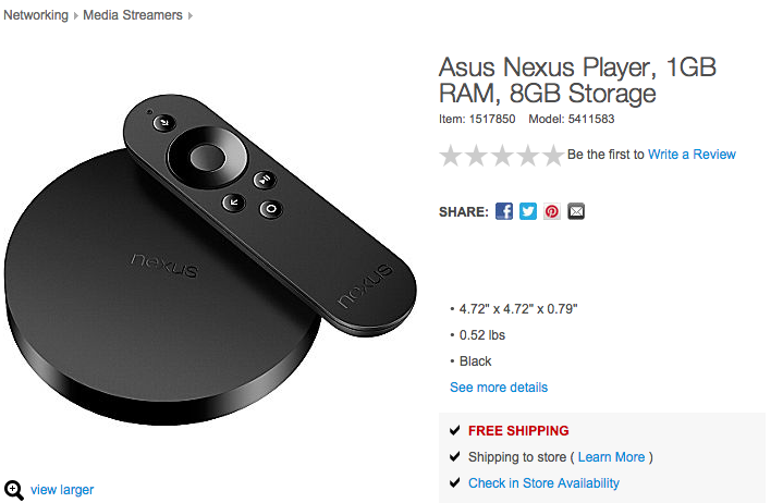 Though Best Buy, Walmart, and TigerDirect show no signs of the device in their online stores, Staples.ca does have a Nexus Player listing with a price that is just a smidgen higher than what Google is charging over on the Play Store. The key difference is that the Nexus Player is apparently sold out at Staples but ships within 1-2 business days from Google. There’s no sign of the Nexus Player Gamepad, so you’ll have to swing by the Play Store if you want one of those, too.