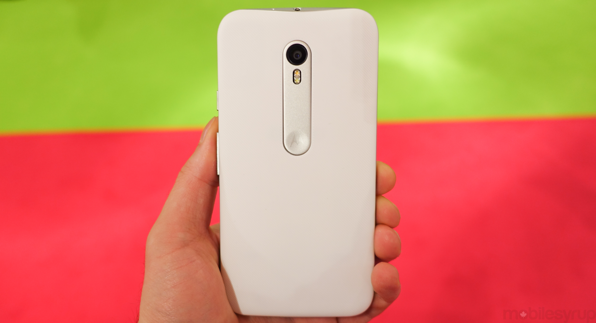 Still built with plastic, this year’s Moto G mimics the back designs of the Moto X Play and Style, inserting a short aluminum strip down the centre, where the camera and flash are housed. This continuity of form is significant for Motorola this year, as it spares the Moto G from being, as it has been in the past, a popular low-cost smartphone with design as an afterthought. Motorola is clearly positioning the new Moto G only slightly below the Moto X Play in terms of performance, and is treating it from a design perspective like a Moto X Mini.