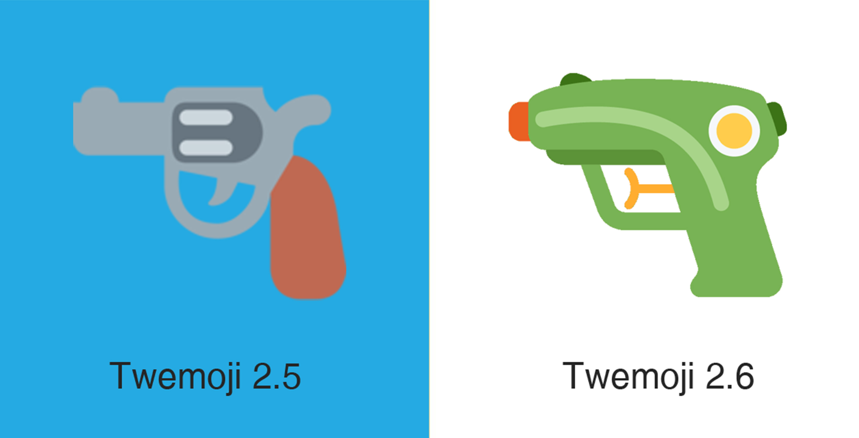 In an April 12th, 2018 update, Twitter made several aesthetic changes to its set of emoji, including altering the magnifying glass icon, adding detail to the knife emoji and changing the gun to a water pistol.