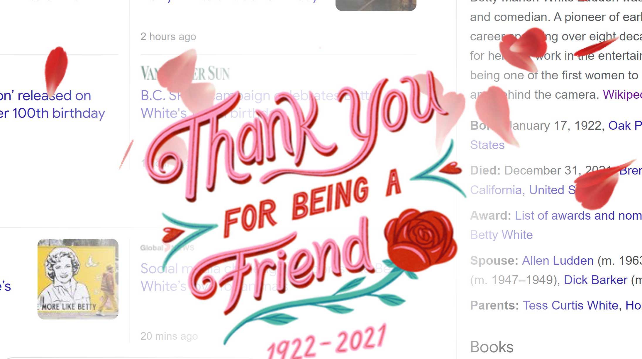 To celebrate the birthday of the late White, Google is showering users with rose petals as a nod to Rose, White’s character from The Golden Girls.