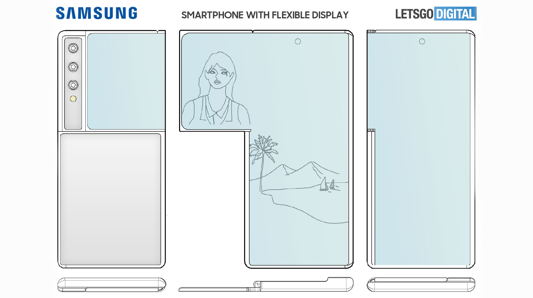 Samsung’s latest patent showcases a phone with an L-shape when unfolded. When it’s folded the screen wraps around the rear, almost touching the camera sensors.