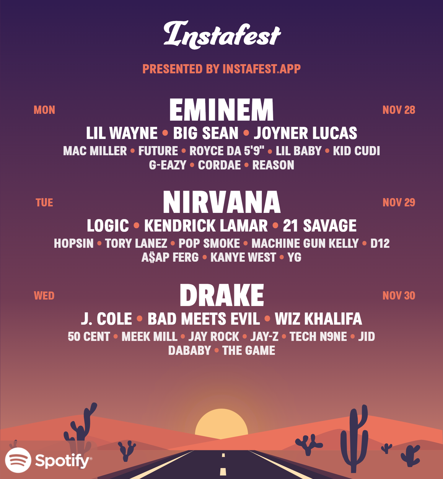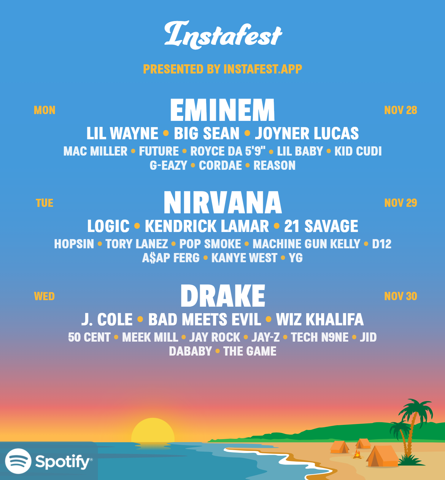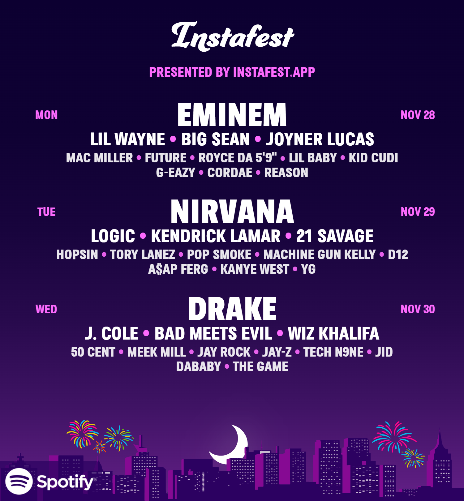 By now, I’m sure you’ve seen plenty of your friends posting their ‘Instafest’ music festival lineups on social media. If you haven’t, it’s basically a fake festival lineup poster-generator that features your most-played Spotify artists on a customizable graphic.