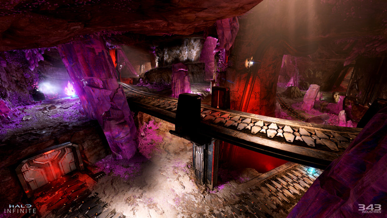 On the other hand, Prism is an asymmetrical map located underground. It’s also called the ‘Needler Map’ by developer 343 Industries. The map is based on the moon Suban, where the ammo for the Needlers, blamite, is mined. Some crystals located on the map are explosive. When you shoot them, they’ll sometimes start glowing and release needle shards, which track nearby players. The map is filled with tunnels, caverns, mining equipment, and huge crystal formations that provide cover when needed.