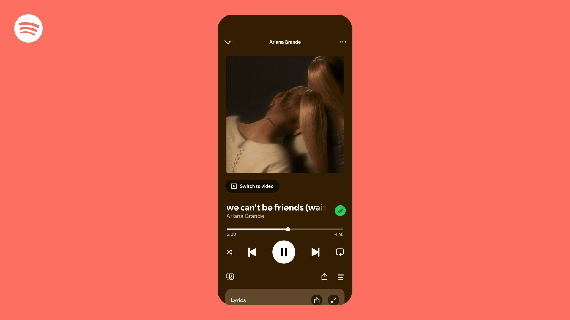 When you do the above, the music video should start playing where the song left off. Users can also access a full-screen experience on mobile devices by rotating to landscape mode. And to go back to regular listening, just press ‘Switch to audio.’