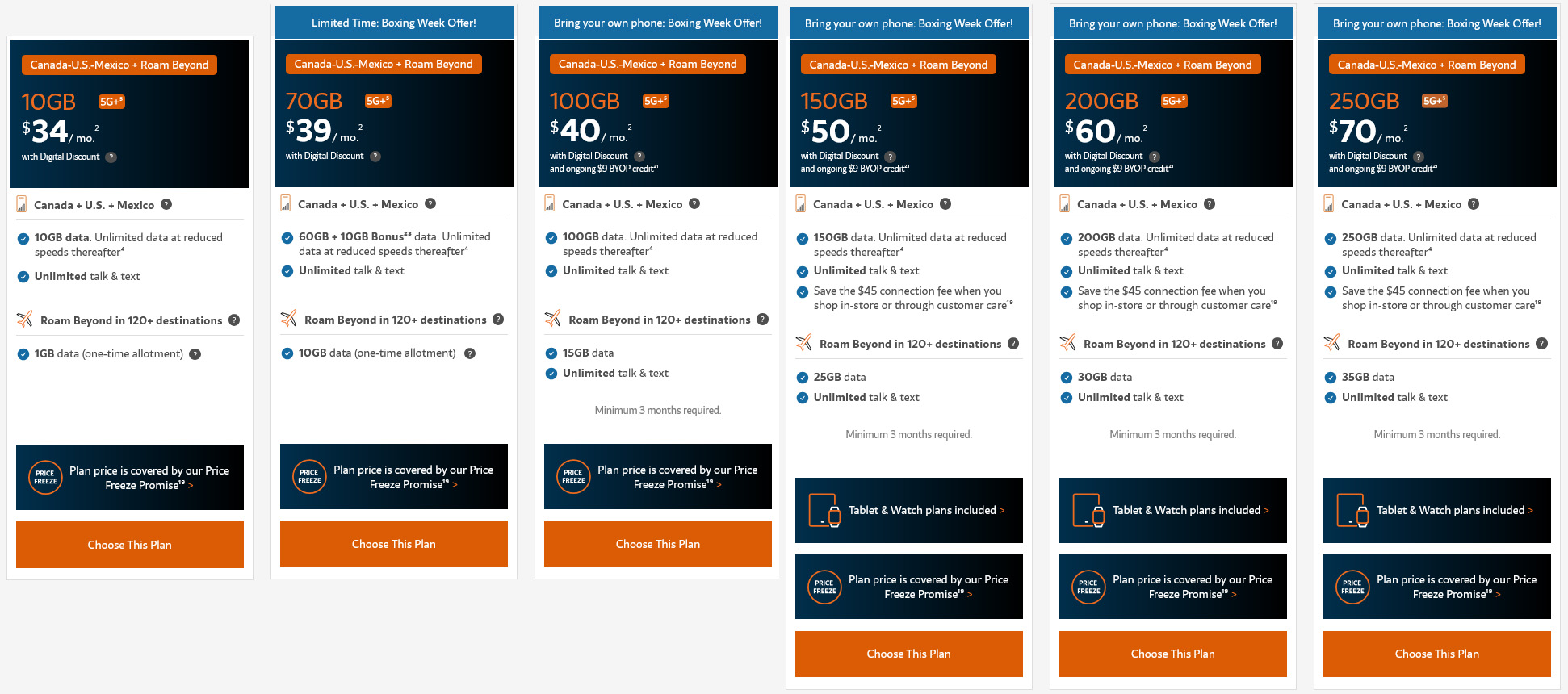 - $39/70GB 5G Canada/U.S./Mexico with 10GB one-time Roam Beyond (unchanged).