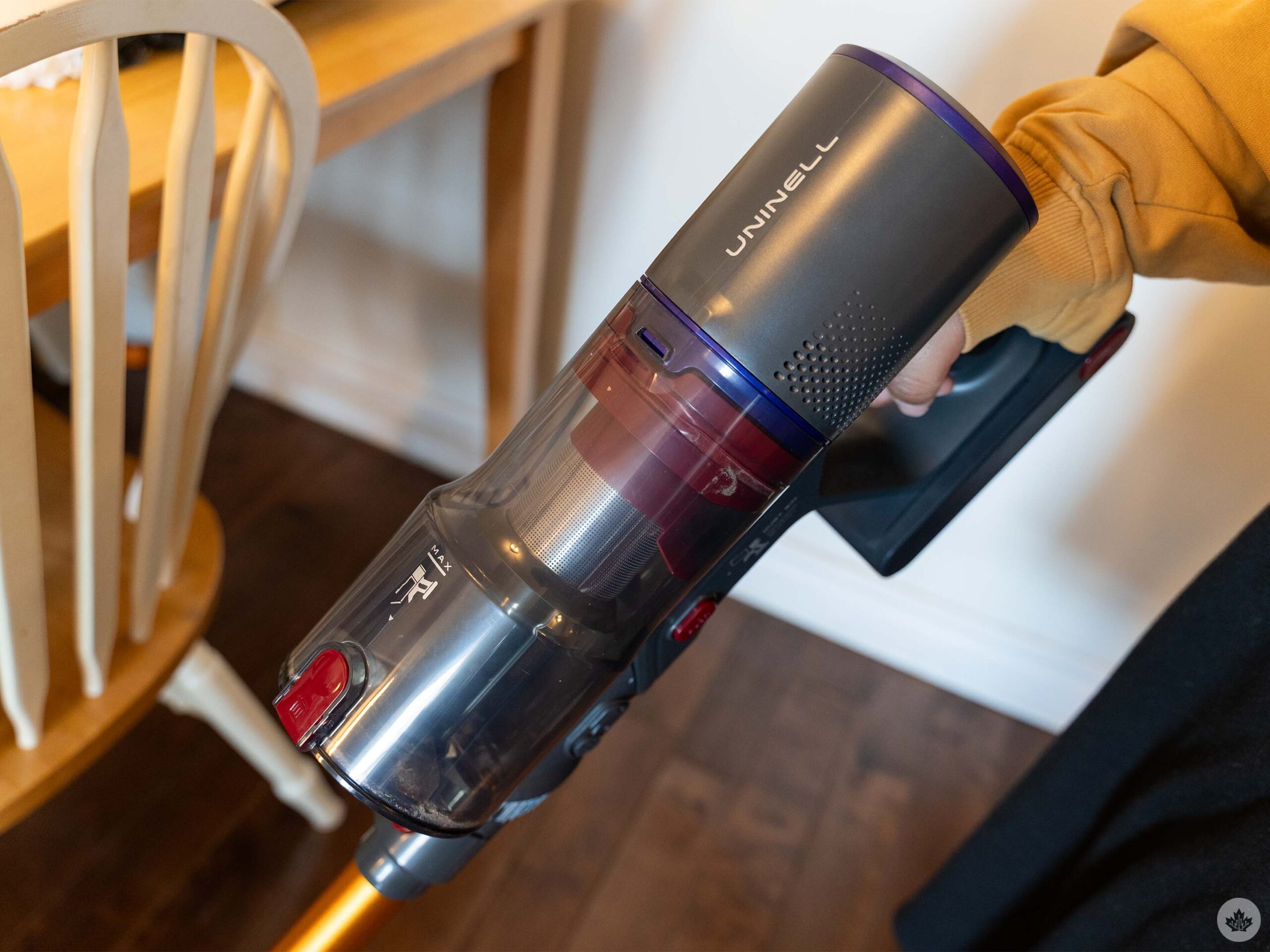 One feature on the Uninell UV5 that I actually enjoy more than the Dyson V11 is that you don’t have to hold the trigger to run the vacuum. The press-and-release power switch allows you to adjust your grip without accidentally turning it off.