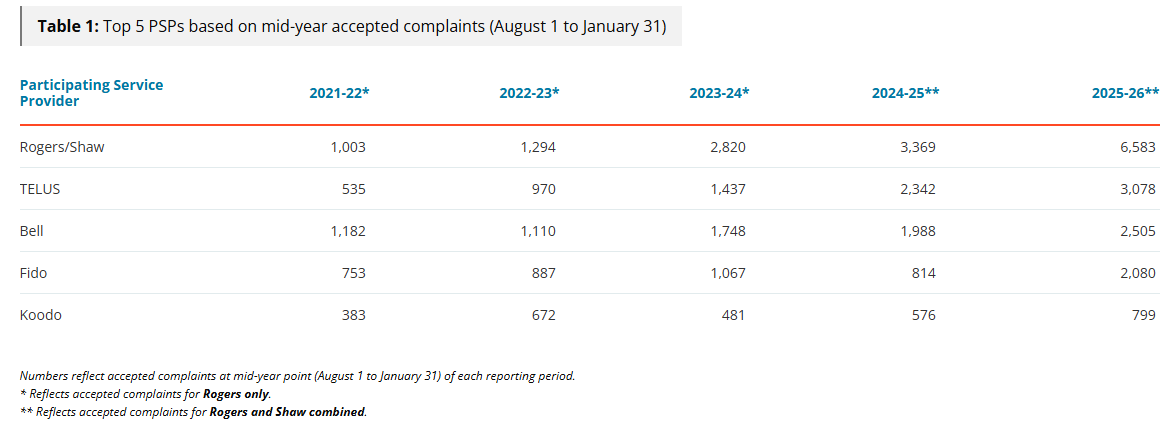 The report covering data between August 1st, 2025 and January 31st, 2026, shows complaints rose by 16 per cent, with Rogers/Shaw accounting for the highest number of complaints (34 per cent) since reflecting their integrated branding as “Rogers together with Shaw,” as noted by the CCTS.