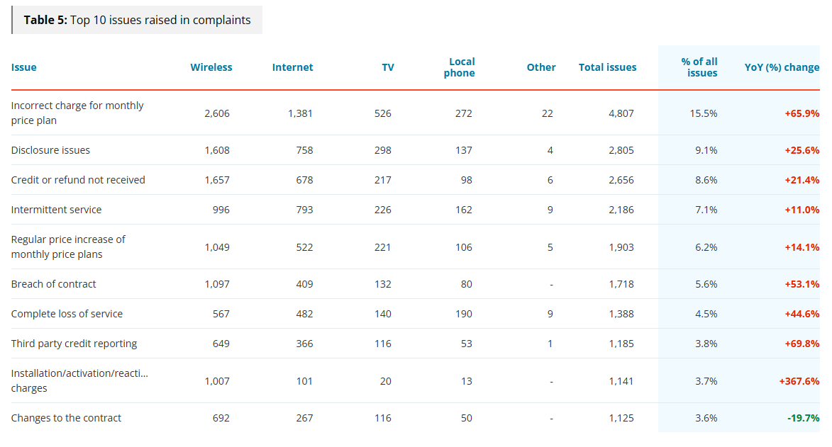 Billing issues remain the dominant complaint driver across all services. Notably, the top reported issue across all services was ‘incorrect charges for monthly price plans.’ That accounted for 15 per cent of issues this year, and rose to a 66 per cent compared to last year’s report.