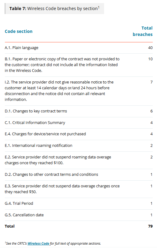 Of the 79 confirmed breaches, Plain Language (Section A.1 of the Wireless Code) was the most frequently breached requirement, with 40 reported instances, representing nearly 50 per cent of total confirmed breaches.